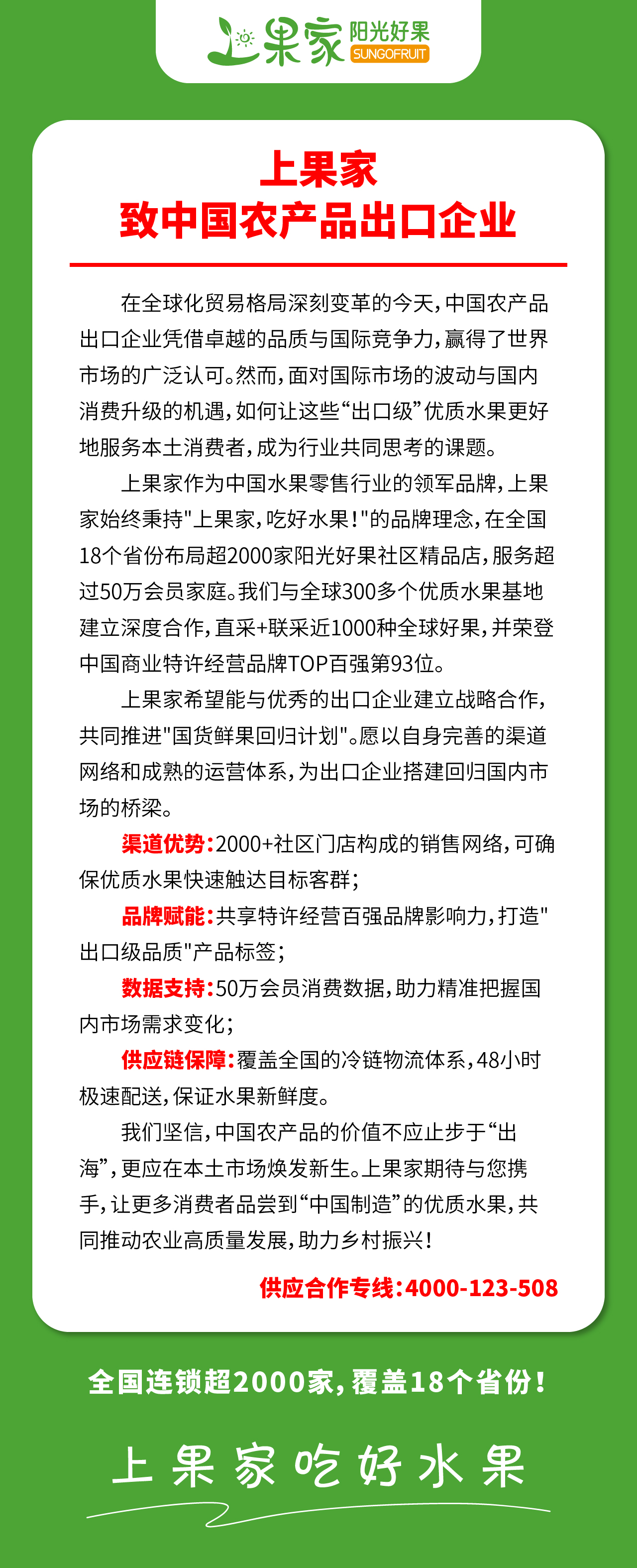 上果家公司是一家專業打造社區水果驛站的連鎖經營企業,在國內外擁有多個果品合作基地,公司以質優價廉的產品,專業的配送為廣大加盟商提供服務。公司致力成為國內可靠的社區水果零售品牌,讓客戶品嘗到美味的.....